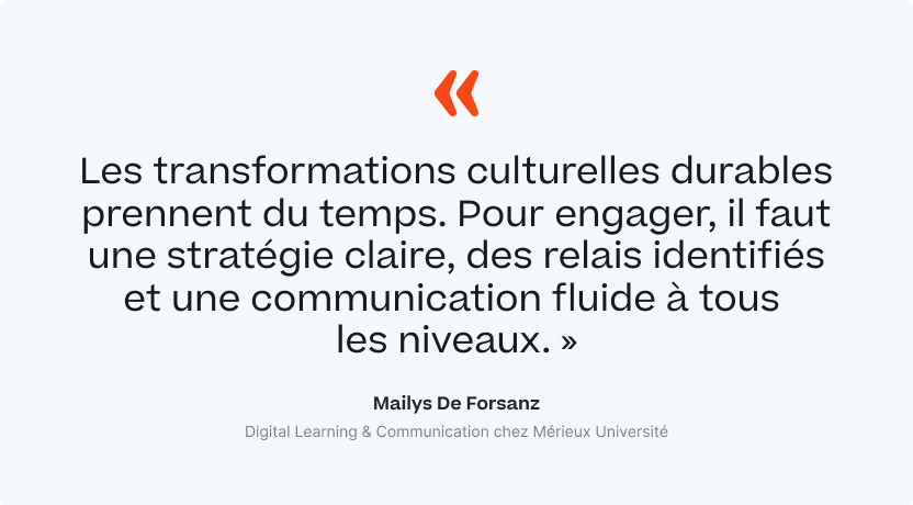 Mérieux Université insiste sur l’importance de prendre le temps nécessaire pour accompagner le changement culturel, souvent sous-estimé mais essentiel à l’adhésion des équipes. Elle souligne la nécessité d’établir une stratégie de communication claire et structurée, capable de toucher tous les niveaux d’influence, en particulier dans un groupe international comptant 24 000 collaborateurs répartis au niveau mondial. Enfin, elle recommande de bien identifier les futurs relais de communication pour en assurer l'efficacité et la continuité tout en pointant du doigt un point fondamental : la communication reste le levier central de l’engagement à l’échelle de l’entreprise.